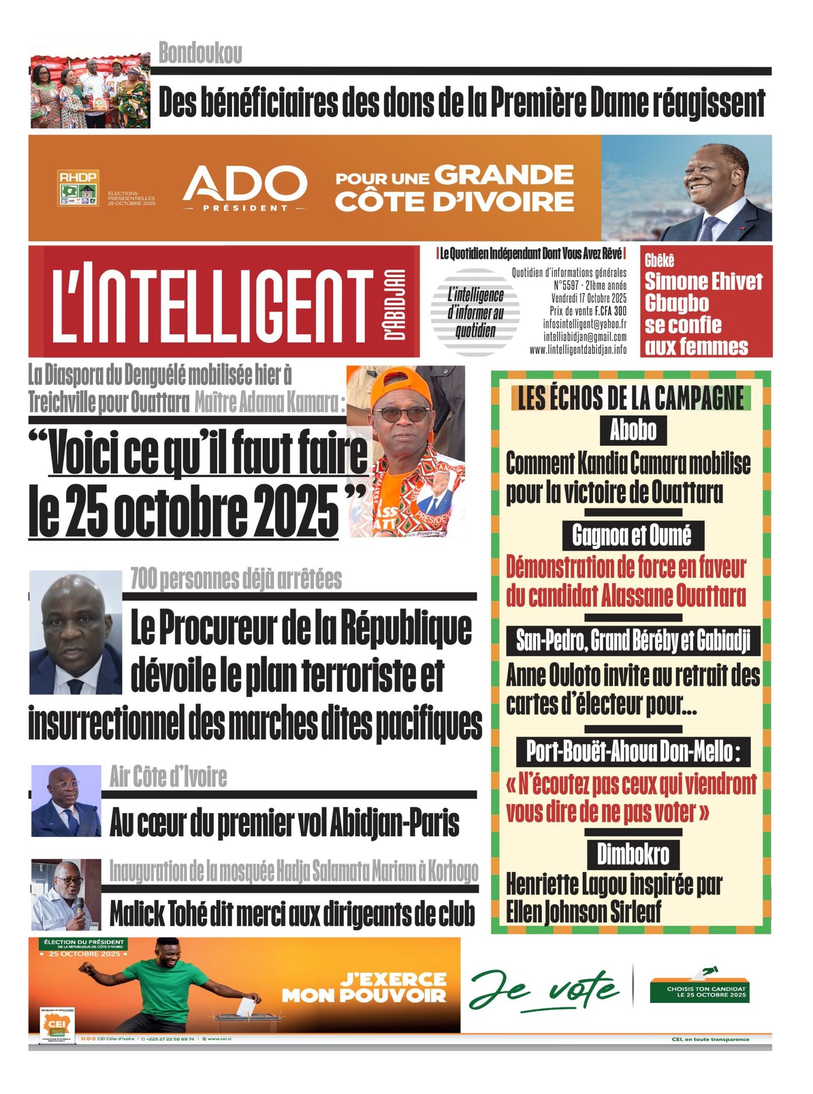 À lire aussi les échos de la campagne du Rhdp à Abobo, Gagnoa, Oumé, Grand Béréby, San-Pedro,et Gabiadji, ce que les candidats Ahoua Don Mello, Henriette Lagou et Simone Gbagbo ont fait et dit, la déclaration du procureur de la République sur les marches du Front commun, la réaction des bénéficiaires des dons de la Première Dame à Bondoukou.