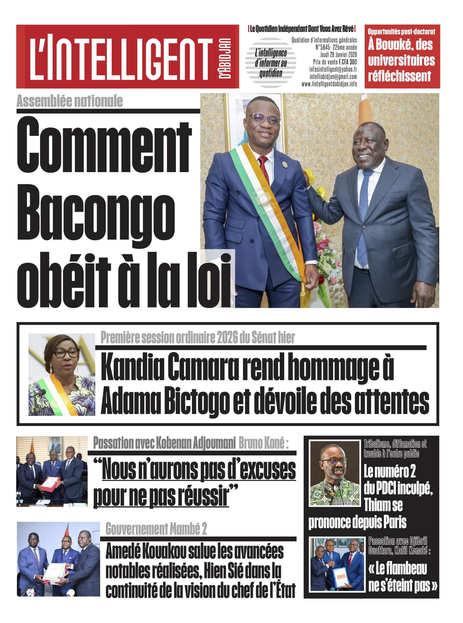 À lire aussi l’hommage de Kandia Camara à Adama Bictogo, ainsi que les attentes qu’elle a dévoilées lors de la première session ordinaire du Sénat, hier; Ce que Bruno Koné a dit lors de la passation avec Kobenan Adjoumani; Amedé Kouakou salue les avancées réalisées, Hien Sié dans la continuité de la vision du chef de l’État ; Le numéro 2 du PDCI inculpé pour tribalisme, diffamation et trouble à l’ordre public,