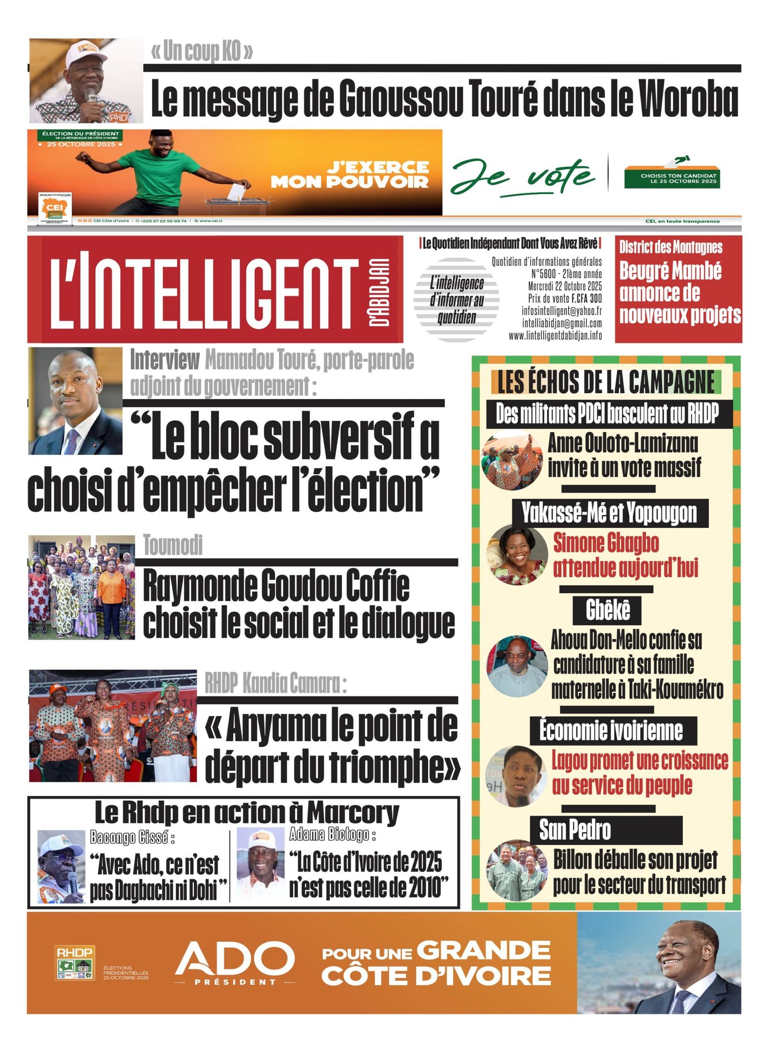 À lire aussi le message de Gaoussou Touré dans le Woroba pour un « Un coup KO », Raymonde Goudou Coffie choisit le social et le dialogue à Toumodi, le message de Kandia à Anyama , ce que Bacongo et Bictogo ont dit à Marcory, Anne Désirée Ouloto-Lamizana invite à un vote massif à Blolequin où des militants PDCI ont basculé au RHDP, Simone Gbagbo attendue aujourd’hui à Yakassé-Mé et Yopougon, Ahoua Don-Mello confie sa candidature à sa famille maternelle à Taki-Kouamékro dans le Gbêke , Henriette Lagou promet une croissance au service du peuple