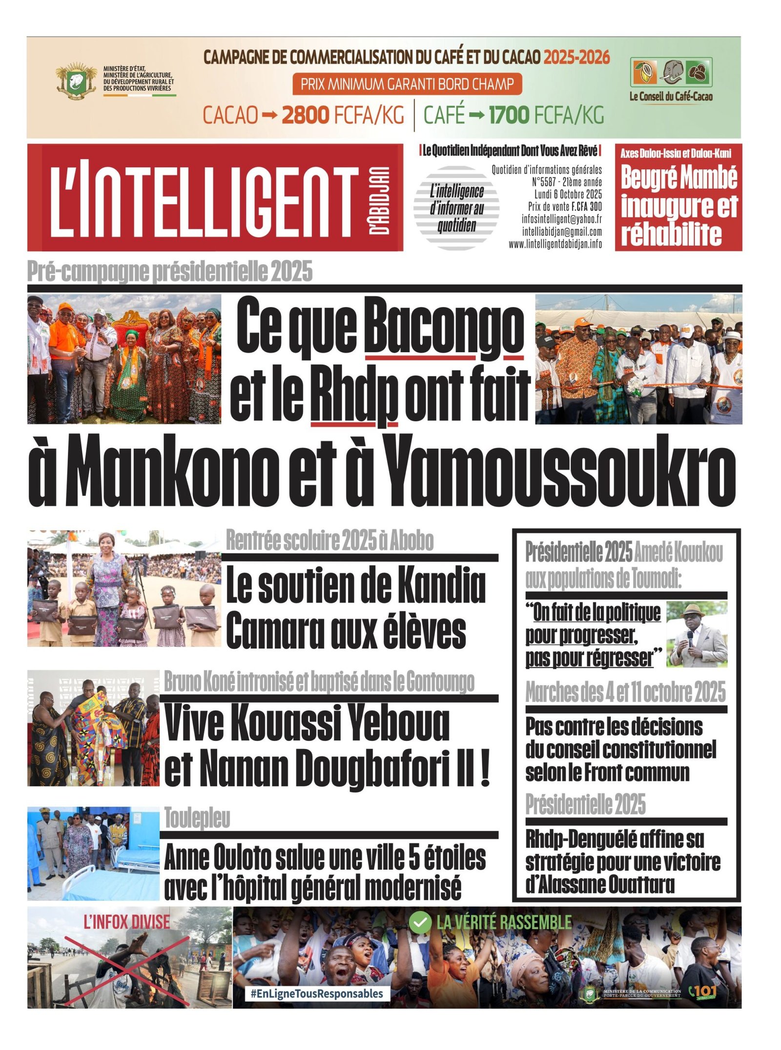 Bruno Koné intronisé et baptisé dans le Gontoungo: Yeboua et Nanan Dougbafori II !, Anne Ouloto salue une ville 5 étoiles avec l’hôpital général modernisé à Toulepleu, ce que Amedé Kouakou a dit aux populations de Toumodi, les Marches des 4 et 11 octobre 2025 , pas contre les décisions du conseil constitutionnel selon le Front commun.