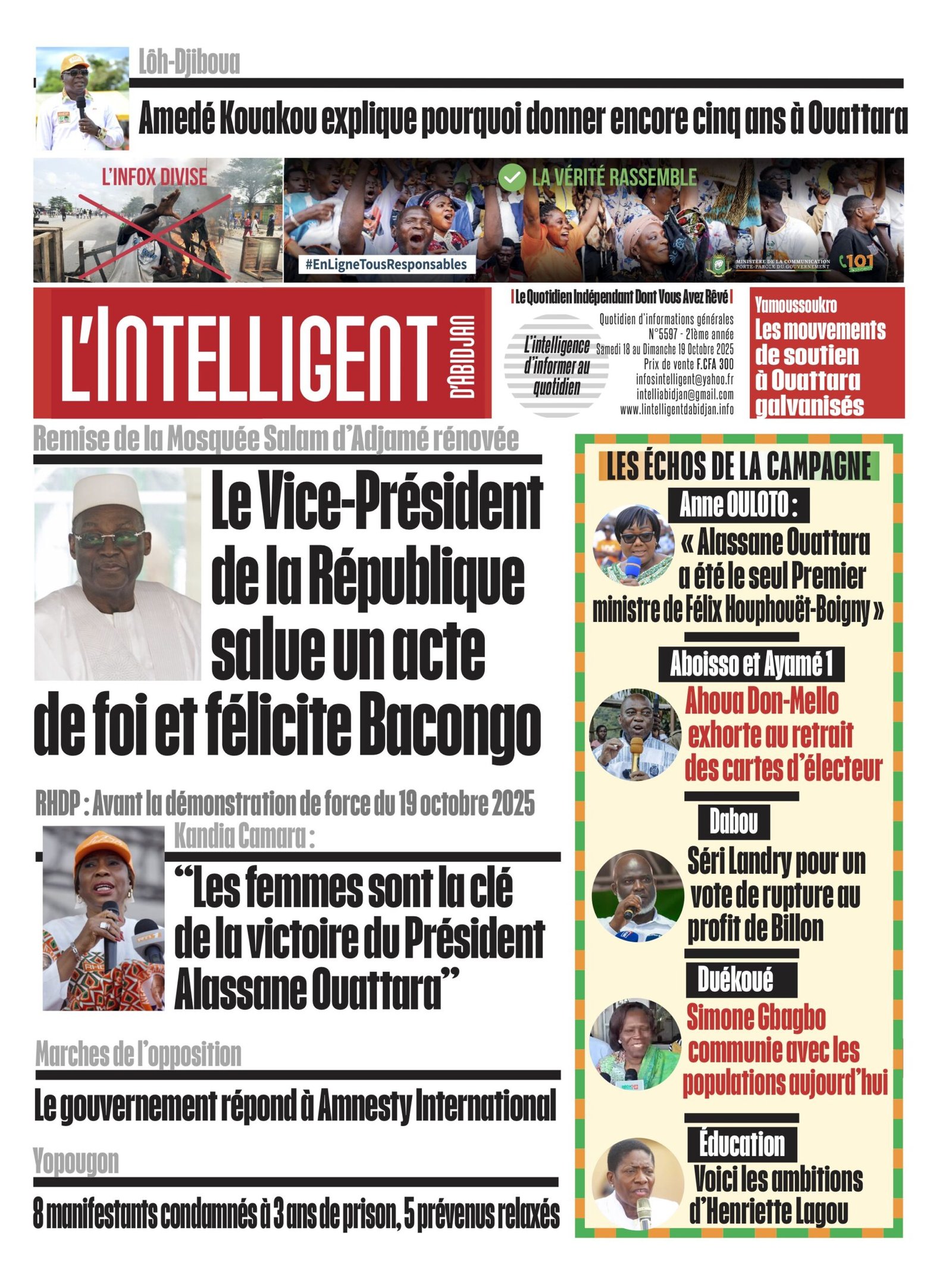 À lire aussi ce que Kandia a dit avant la démonstration de force des femmes du 19 octobre 2025, la réponse du gouvernement à Amnesty International concernant les marches de l’opposition, 8 manifestants condamnés à 3 ans de prison, 5 prévenus relaxés à Yopougon, ce que Anne Ouloto a dit en dénonçant des jeunes payés à 3000 FCFA pour bloquer l’élection, Ahoua Don-Mello exhorte au retrait des cartes d’électeur à Aboisso et Ayamé 1, Séri Landry pour un vote de rupture au profit de Billon depuis Dabou, Simone Gbagbo en meeting à Duékoué aujourd’hui, l’ambition de Lagou pour l’éducation.