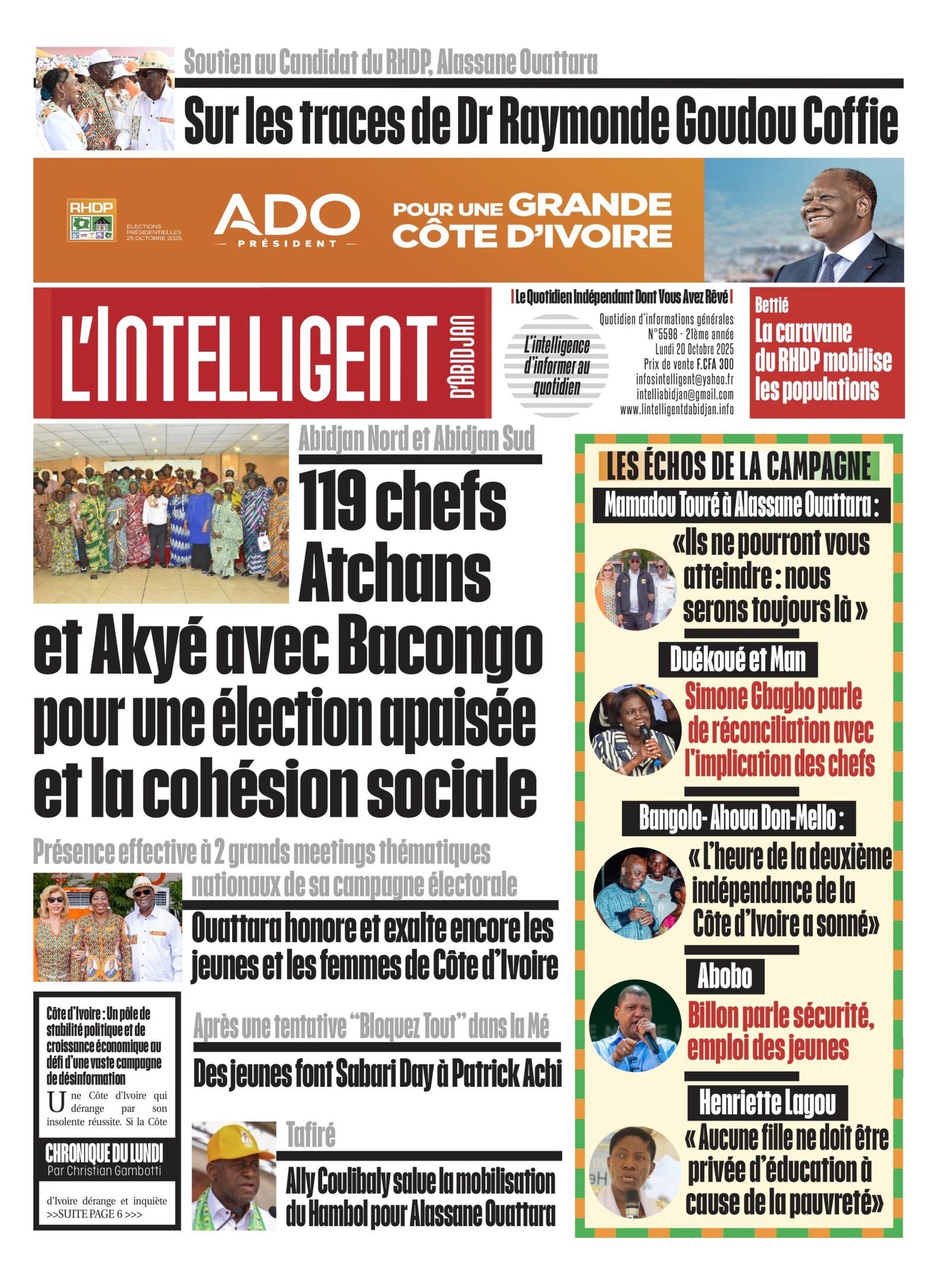 “Bloquez Tout” dans la Mé, Ally Coulibaly salue la mobilisation du Hambol pour Alassane Ouattara à Tafiré, la chronique de Christian Gambotti “Côte d’Ivoire : un pôle de stabilité politique et de croissance économique au défi d’une vaste campagne de désinformation”, ce que Mamadou Touré a dit à Ouattara lors du meeting de la jeunesse RHDP, le message d’Ahoua Don Mello à Bangolo, Billon parle sécurité, emploi des jeunes à Abobo.